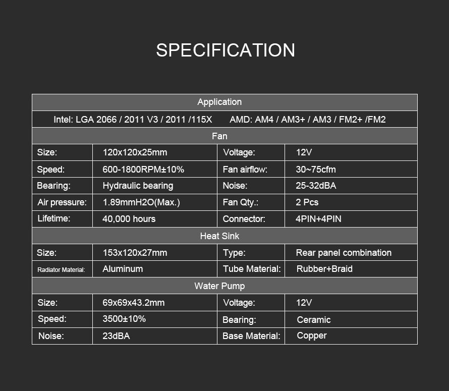 | Block Compatibility | Intel LGA 1120/1150/1151/1155/1156/1366/2011/2011-V3 AMD FM2/FM1/AM3+/AM3/AM4/AM2+/AM2/FM2+ |