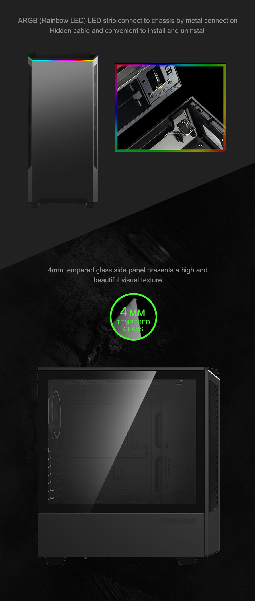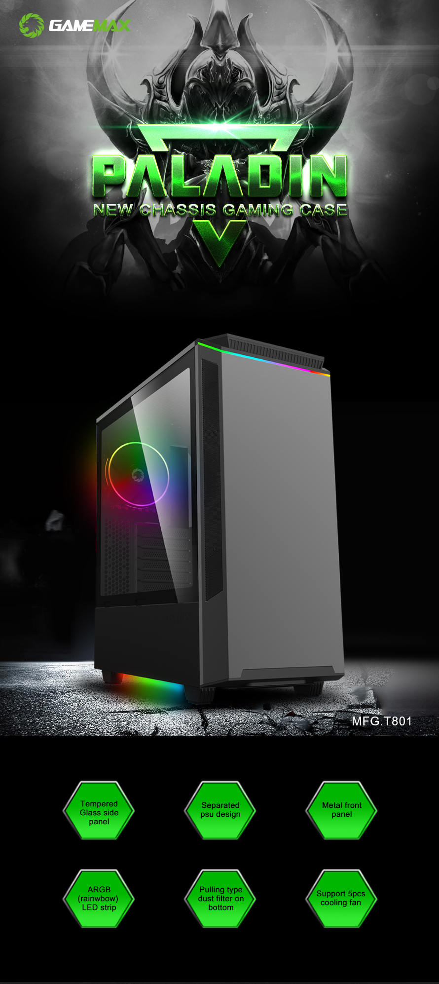 It introduces an all new framework that further enhances clean interior and exterior design with intuitive and convenient installation. With the highest build quality in its class, featuring a full metal exterior and tempered glass side panel, the Paladin is everything you need to build your perfect system. <br/><br/> The Paladin T801 compact mid-tower case features a unique one-pcs screw easy open glass side window, and along with top and bottom ARGB strips. You can effortlessly control ARGB lighting and fans via GameMax V2.0 PWM+Rainbow HUB controller pre-installed, while Adaptive Noise Reduction optimizes via PWM controls. Includes 2x ARGB LED strips and 1xPCS ARGB 12cm Rainbow fan pre-installed to enhance the aesthetics of your build as seen through the Paladin's stunning tempered glass panel.<b>also Paladin model has optional vertical graphic card holder to provide flexible installed position.</b>