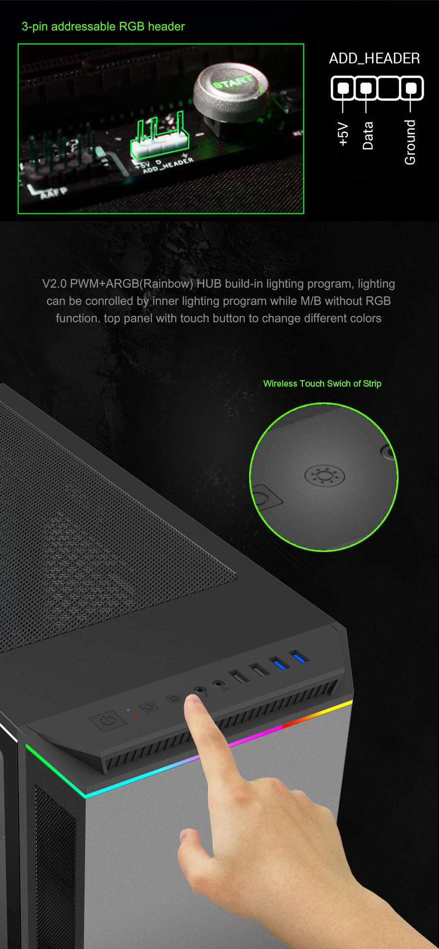 | Front Panel | Metal Panel Along with ARGB rainbow strip | |
