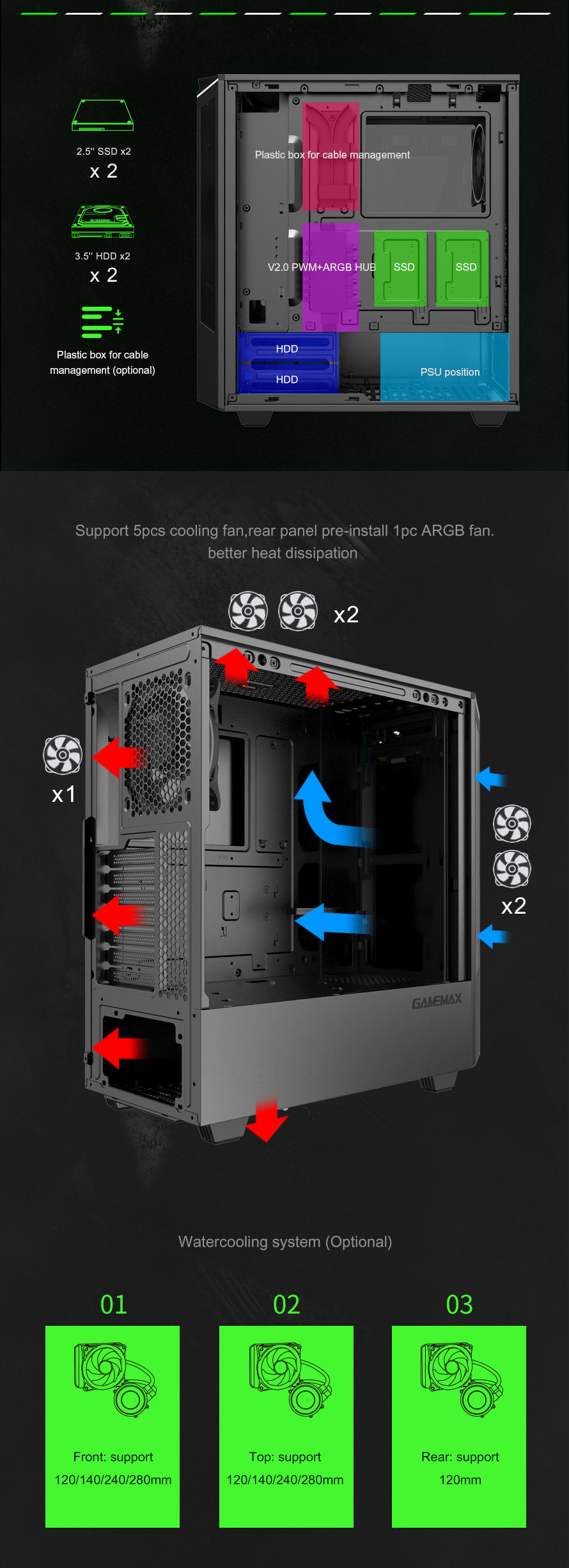| Water Cooling Support (Radiator Size) | Front | 120/140/240/280mm(Support) |