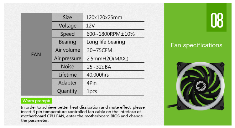 | Fan RPM | 600~1800 RPM(PWM) +/- 10% |